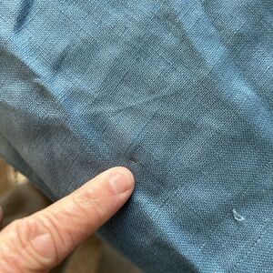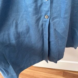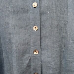 Cornflower blue 100% linen button down dress with collar. Gorgeous color and buttons! Please note: linen is a natural material so there is some natural variation in fibers/threads. There are 3 small spots (one on front, two on back at bottom) that appear to be missing a thread. They are not holes, but just small areas that are thinner. See pics. Otherwise in new condition.