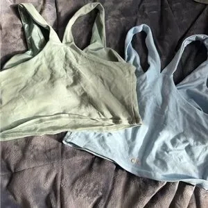 Pair of ALO Yoga tanks. One olive, one light blue. Ideal for yoga or casual outings.