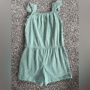 Adorable sage green romper with eyelet ruffle straps. Ideal for everyday comfort.