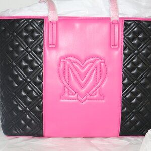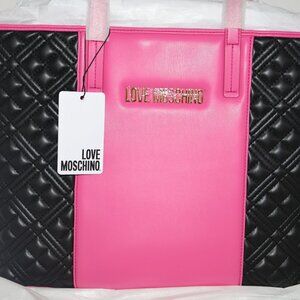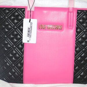 Authentic Love Moschino quilted tote bag featuring a bold black and pink colorblock design with gold-tone hardware. Spacious interior with a structured silhouette, perfect for everyday wear, work, or travel.
