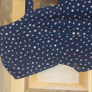 Navy with pink polka dots tie back blouse, keyhole front, mixed material