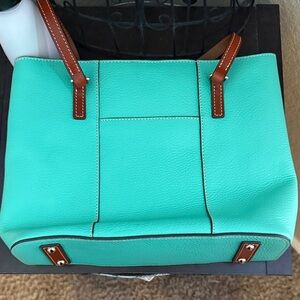 Stylish aqua leather tote with brown handles. Perfect for daily use. Durable and elegant design.