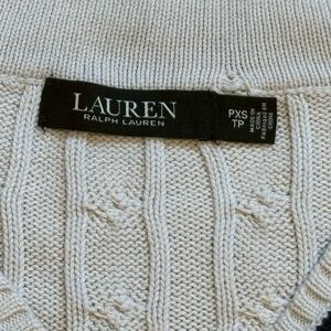 Lauren Ralph Lauren black label white & blue cable knit cricket v-neck sweater, sz PXS. The king preppy, this LRL piece has a gorgeous statement monogram logo with its cable knit design that is sure to capture the attention of anyone who sees this piece. A classic sign of style and prestige! Made of 100% cotton!