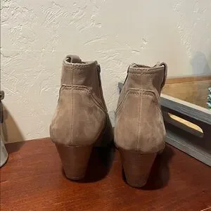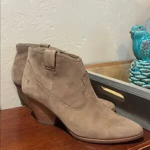 Super soft leather with western design and zipper side. Stacked brown heel, 3 inch. Easy on and very comfortable in my opinion.