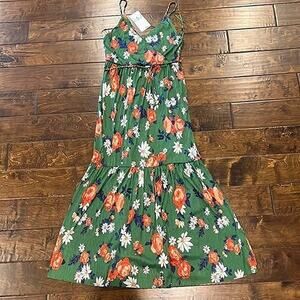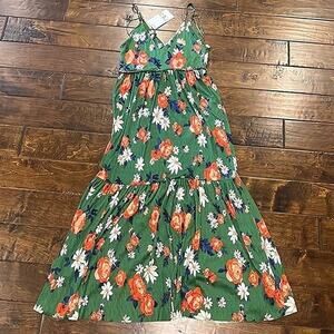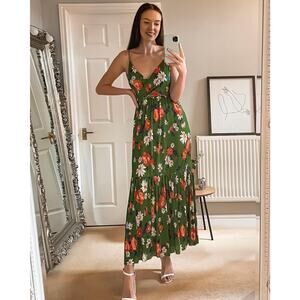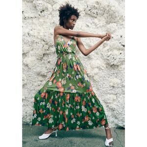 Green long dress with wrap V-neckline and spaghetti straps. Elastic waistband. Woven self belt. From ZARA, in size M and L. New with tags. Sold out in stores.