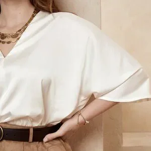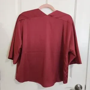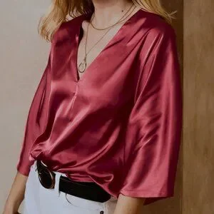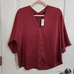 Gorgeous brand new with tags Banana Repulic Factory satin top.Ruby Rose is a color is from the 2022 collection, very hard to find! I've had it for two years now, and never got around to wearing it; although it is a very beautiful piece with a delicious dark raspberry wine color, it is a little too cold for my complexion. Dolman sleeve, oversized cut (I'm an S and it is still oversized on me), stitching at the center front, deep and narrow V-neck, paneled V-neck design at the back.