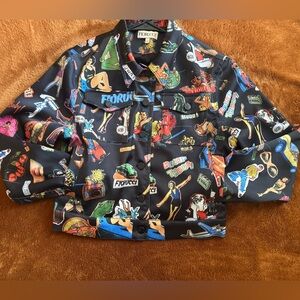 Bold Fiorucci jacket with vibrant graphics. Eye-catching and fun. Super soft and sleek, satin feeling material. All measurements are shown in photos listed above :)