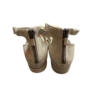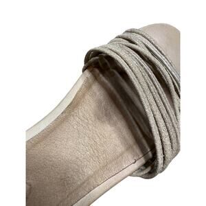 Soft metallic leather sandals by Eileen Fisher featuring multiple slender straps, a cushioned leather footbed, and a subtle wedge sole. The back-zip design adds ease and a modern touch. Comfortable and versatile for casual or dressy wear.