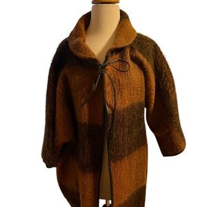 You can find this coat at the FIDM Museum collection if you type in Bonnie Cashin mohair NOH coat FIDM. Made with woolly mohair in a chocolate and black color and trimmed with black leather. Had two half moon pockets and ties at the collar. Unlined. Estimated size medium/large.