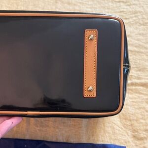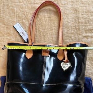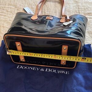 Timeless Dooney and Bourke tote, new with tags crafted of patent leather, Leather trim and classic gold hardware. Ample space for daily use. Features signature charm. Please see attached video and pics to verify condition and for details