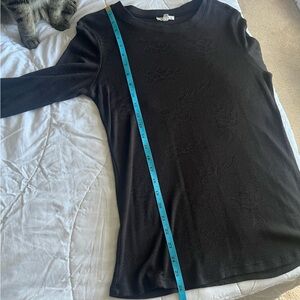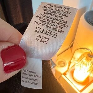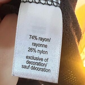 Material is 74% rayon, 26% nylon. Machine wash cold. Tumble dry low.