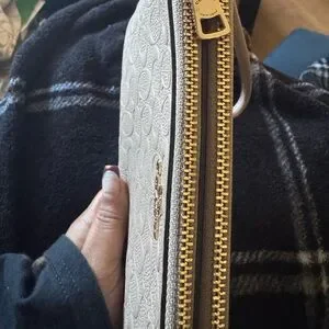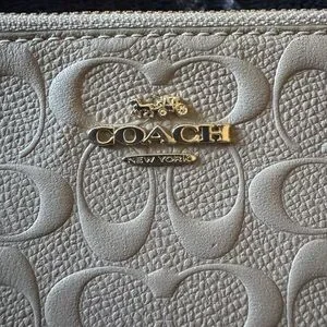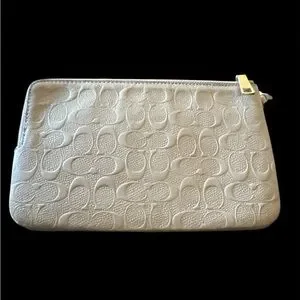 Stylish Coach wristlet with embossed pattern. Features a sleek wrist strap