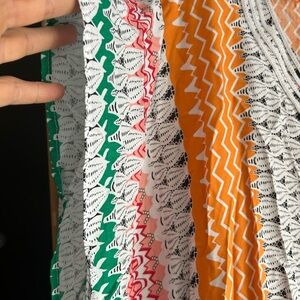 Vibrant kaftan dress with orange, green, and white stripes. Perfect for a relaxed, stylish look.