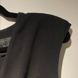 Elegant black midi dress featuring a stylish front draping design and padded shoulders. Perfect for elegant occasions. Unlined. New never worn without tags NWOT.