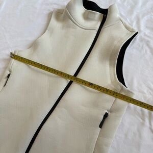 Off-white sleeveless jacket with black zipper. Features side pockets and high collar.
