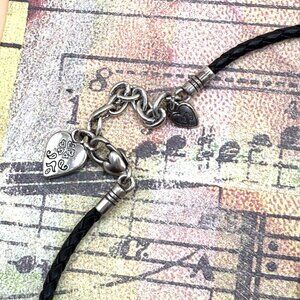 Stunning authentic Brighton silver tone and black necklace with large solid detailed heart pendant. Has an extender to adjust. Working clasp. Has the signature B for Brighton hang tag. Woven braided solid black leather cord for a modern boho look. Smoke free. Great condition. Fast and secure shipping. Authentic Brighton designer jewelry. Cord is approximately 18 inches end to end including the clasp and extender. Will fit as a necklace or choker depending on your neck size and how you adjust it.