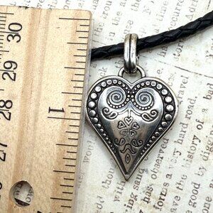 Brighton Classic Ornate Silver Puffy Heart Pendant Necklace Black Braided Chain