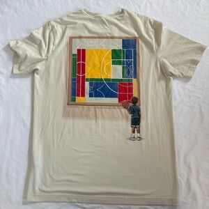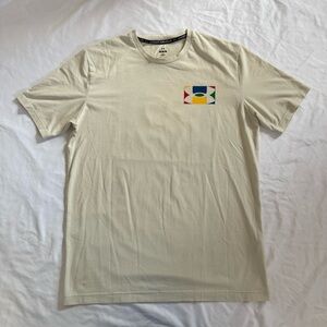 Beige short sleeve tee with a multicolor logo. Comfortable and casual style.