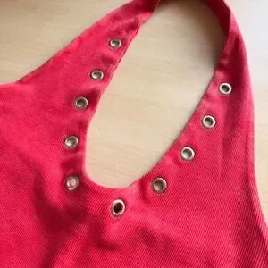 Bold early 2000s halter tank in a vibrant pinkish-red stretch ribbed knit. Features a deep scoop neckline with silver grommet eyelet detailing for a statement edge
