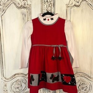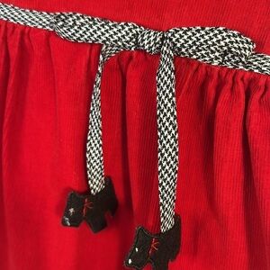 Jumper is of red corduroy with black and white houndstooth trim, bordered in embroidered and appliquéd heart and Scotty design