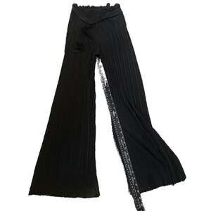 Bloom Seasons Black Pleated Pants, size Large, offering a lightweight and comfortable fit with a stretch fabric. These pants feature a stylish tie waist and an elegant pleated design, making them perfect for versatile styling. Made from 92% Polyester and 8% Spandex, they provide a flattering drape and ease of movement. Slight staining that can be easily washed. Otherwise great condition
