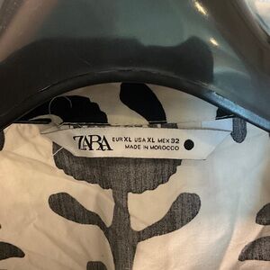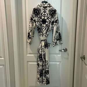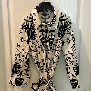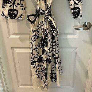 Elegant long sleeve dress. Features bold black floral pattern. Perfect for any occasion.