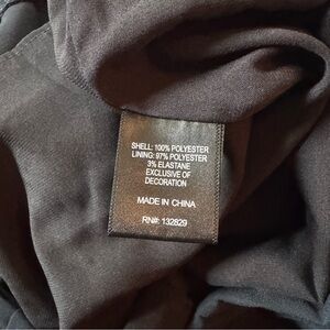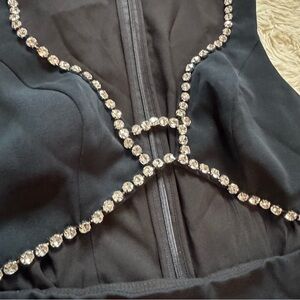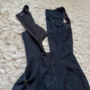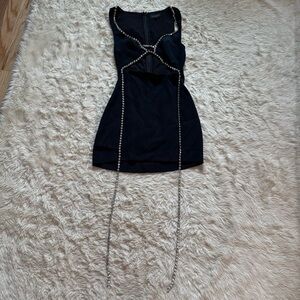 Chic black dress with white trim. Features cut-out design. Perfect for evening wear.