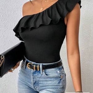 Stylish black ruffled one-shoulder top. Perfect for a chic look.