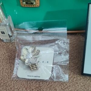 Chic teal handbag with tan accent bundled with Chanel Jo Malone Peach and Lily earrings and a broch