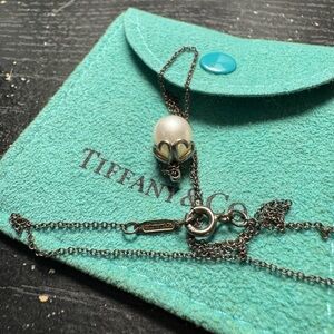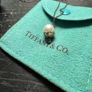 Chic Tiffany & Co. necklace with a white pearl pendant. Silver chain offers timeless elegance. Heart pattern around pearl.