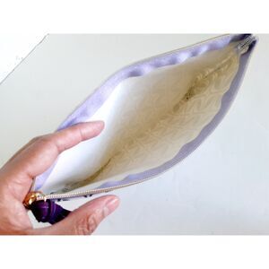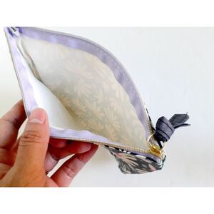 Printed white florals and abstract in green & navy color with a contrastiing purple zip closure