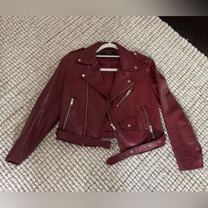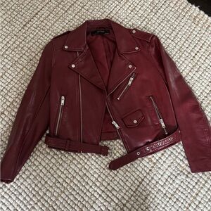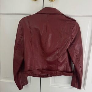 Chic deep red faux leather biker jacket. Features asymmetric zipper and metal accents. Worn once. Perfect condition.