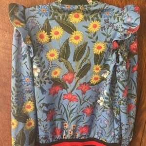 Elegant Gucci blue bomber jacket with vibrant floral design. Features colorful flowers and zip closure. Stylish and bold.