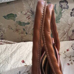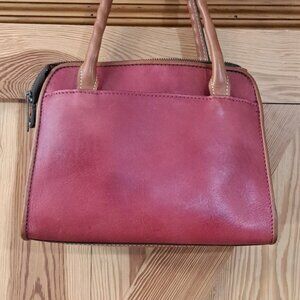 Corners great, twisted brown leather handles are good. Bottom is brown. Main body is a reddish brown. Edging is brown which contrasts nice with the reddish brown.
