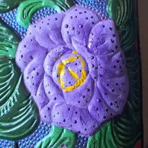 This hand painted leather bag from a well known designer features an embossed floral design which I have painted with lavender and purple roses with yellow accents. Two tone green leaves surround the roses. Metallic blue gives a pop behind the flowers. Perfect for adding a touch of elegance to any outfit.