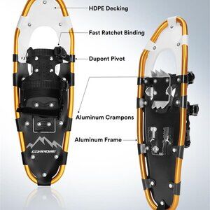 Gorpore Lightweight Aluminum Snowshoes Kit with Poles Carrying Bag for Men Women Adult Youth Kids Lightweight Material * Lightweight 6000 Series high-quality aluminum frame make you easy walk for your hiking and climbing. Special Design * The ergonomic streamlined design and slightly upturned round tail. ensure that you can get maximum floatation and fast movement in the snow. Put on quickly * Simple ratchet upper with quick release and buckled safety heel strap user-friendly fast ratchet binding system to ensure quick and easy access every time. Excellent Grip * The bottom of snowshoes has heavy-duty rotating crampons which can penetrate dig into snow and snow to increase traction and control. Sizes Weight Capacity * 21 Inches 70 - 150 lbs / 31 - 70 kg * 25 Inches 120 - 180 lbs / 55 - 82 kg * 30 Inches180 - 250 lbs / 81 - 114 package Included * Snowshoes Trekking Poles Carrying bag Dimensions 10.70 x 5.20 x 31.00 Inches