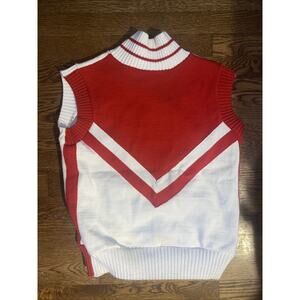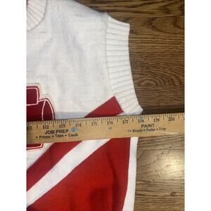 Stylish sleeveless sweater with bold red and white design. Features a prominent letter emblem on the front. Perfect for casual wear.