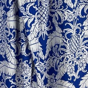 Comfy wide leg pants. Elastic waist. Tropical, white on blue print with pineapples. Pull on. Lightweight linen / rayon blend.