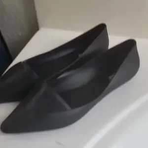 Sleek black flats by Melissa. Features a textured toe detail. Perfect for everyday wear.