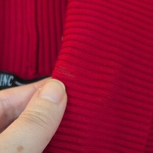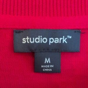 Vibrant red sweater with a playful martini glass design. Matching red surplice v neck sweater with stylish buckle accents. Perfect for a chic and fun look.