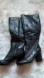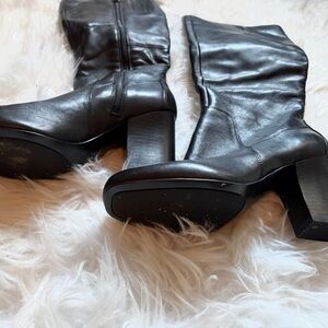 Classic heeled black leather boots. Sleek design with a modern touch. Ideal for versatile styling.