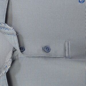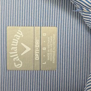 Stylish and comfortable light blue striped polo. Features long sleeves and classic design. Ideal for casual or a day of golf. Opti-Dri technology. Callaway logo on front chest. Men's large. Care tag missing. Has a faint stain on front, but hard to see with the stripes. Shown in last photo.