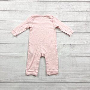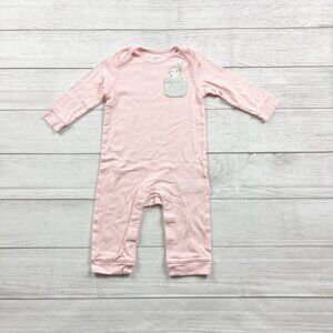 Pink one piece long sleeve romper with snaps at legs. Bunny rabbit at pocket. Easter. Cotton