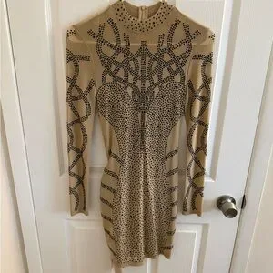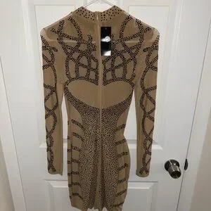Step out in style with this elegant tan dress featuring intricate black patterns. Perfect for any occasion, this dress combines sophistication with a modern edge.