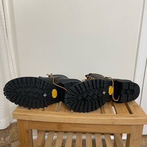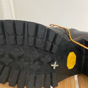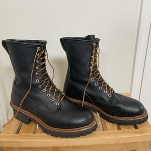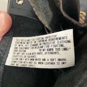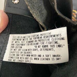 Classic black leather boots with sturdy brown laces. Ideal for rugged wear. Has the special firefighter X on bottom with certification inside on label. Only wore a couple times excellent condition. Great gift especially for a Firefighter!