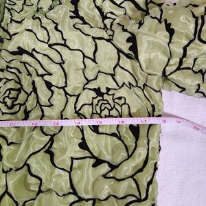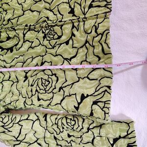 Beautiful textured floral jacket by ALGO featuring an allover floral pattern in light lime green with bold black outlines. Shiny, dimensional fabric gives this zip-up a unique, eye-catching boutique look. A great statement piece for fans of retro, Y2K, or art-to-wear styles. Perfect for dressing up basics or adding a pop of personality to any outfit. Stretchy fabric.