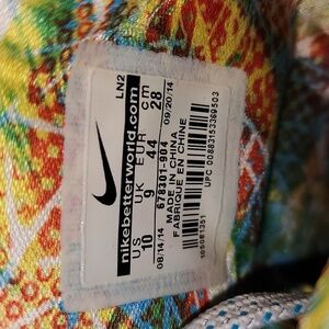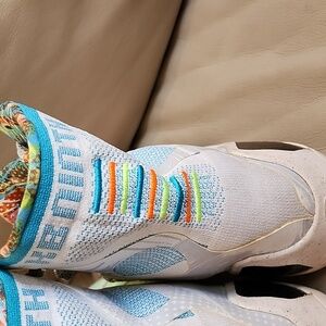 Vibrant high-top sneakers with a multicolor design. Features a unique pattern and lace-up style.