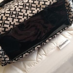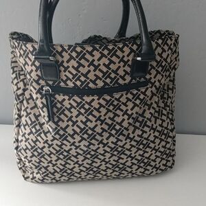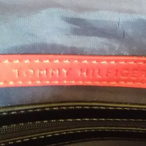 Tommy Hilfiger tote. This bag features a full size zippered pocket in the front with a smaller zippered pocket in the back snap to close. Big main compartment with a standard zippered pocket inside and two open phone pockets.