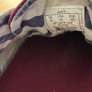 GUC. Gently used. Colors: dark red with warm light gray stripes. Canvas. Lightweight. Six metal eyelets. White sole with good tread and life remaining.