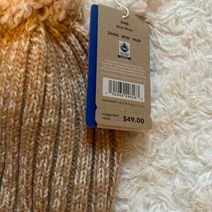 Cozy tan knit beanie with a playful pom. Perfect for chilly days.